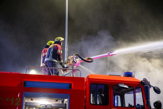 Durch einen massiven Löschangriff über zwei Wasserwerfer konnte eine weitere Ausbreitung des Feuers und ein Übergreifen auf angrenzende Gebäude verhindert werden. Zur Unterstützung wurden die Feuerwehren Fockbek und Büdelsdorf nachalarmiert. Für die Löschmaßnahmen mussten mehrere hundert Meter Schlauchleitung verlegt werden, um eine ausreichende Löschwasserversorgung sicherzustellen. Gegen 00:25 Uhr konnte der Einsatzleiter der Leitstelle melden, dass das Feuer unter Kontrolle sei. Die Nachlöscharbeiten dauerten noch bis etwa 01:00 Uhr an.