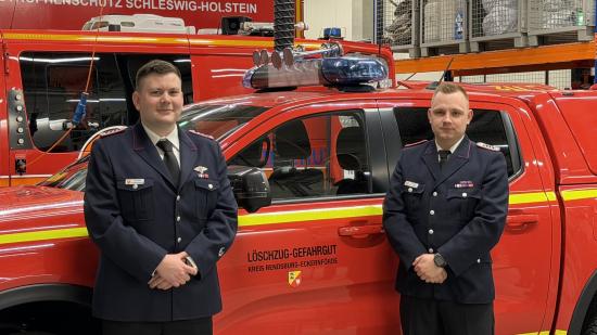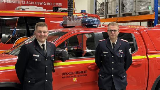 Tim-Michael Behrens und Lucas Johannsen wurden nach Abschluss der Ausbildung zum Gruppenführer zum Löschmeister ernannt.