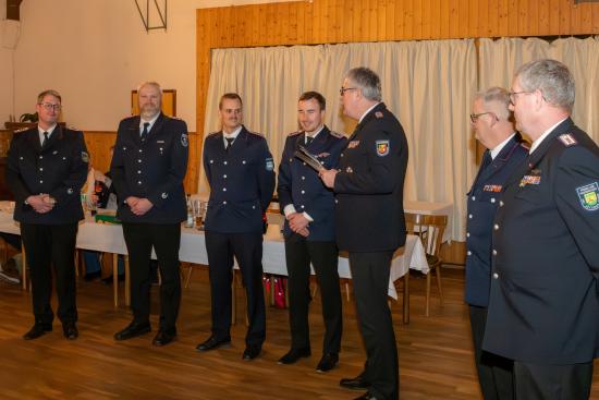 Ein weiterer Schwerpunkt lag auf der Aus- und Fortbildung. Auch im Jahr 2025 wurden zahlreiche Lehrgänge auf Amts-, Kreis- und Landesebene besucht. Unter anderem nahmen 33 Kameradinnen und Kameraden an der Truppmannausbildung Teil I, 26 an Teil II, 35 an der Truppführerausbildung sowie 57 an Erste-Hilfe-Grundlehrgängen teil. Weitere Ausbildungsmaßnahmen umfassten unter anderem Motorsägenlehrgänge, Technische Hilfeleistung, Gruppenführung, digitalen Sprechfunk sowie Übungen im Brandübungscontainer. Zudem konnten 9 neue Atemschutzgeräteträger ausgebildet werden. Ergänzend wurden verschiedene Spezial- und Führungslehrgänge besucht.
