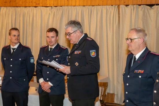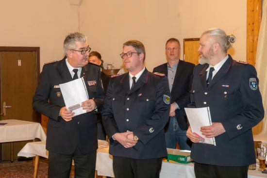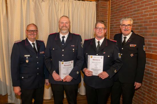 Kreiswehrführer Mathias Schütte überbrachte die Grüße des Kreisfeuerwehrverbandes und dankte für die geleistete Arbeit. Er informierte unter anderem über die geplante Anschaffung eines neuen Brandübungscontainers sowie die angespannte Situation an der Landesfeuerwehrschule in Harrislee. Zudem wurde auf den Personalbedarf in der Technischen Einsatzleitung (TEL) sowie im Löschzug Gefahrgut hingewiesen. Im Rahmen der Versammlung wurden Sven Volkmann und Andre Koberg zum Brandmeister sowie Kevin Langbehn und Dennis Haß zum Oberlöschmeister befördert.
